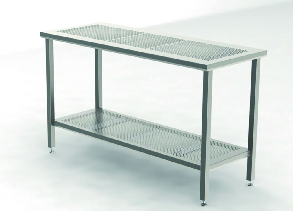 | Description: | Cleanroom table with perforated worktop and perforated shelf |
