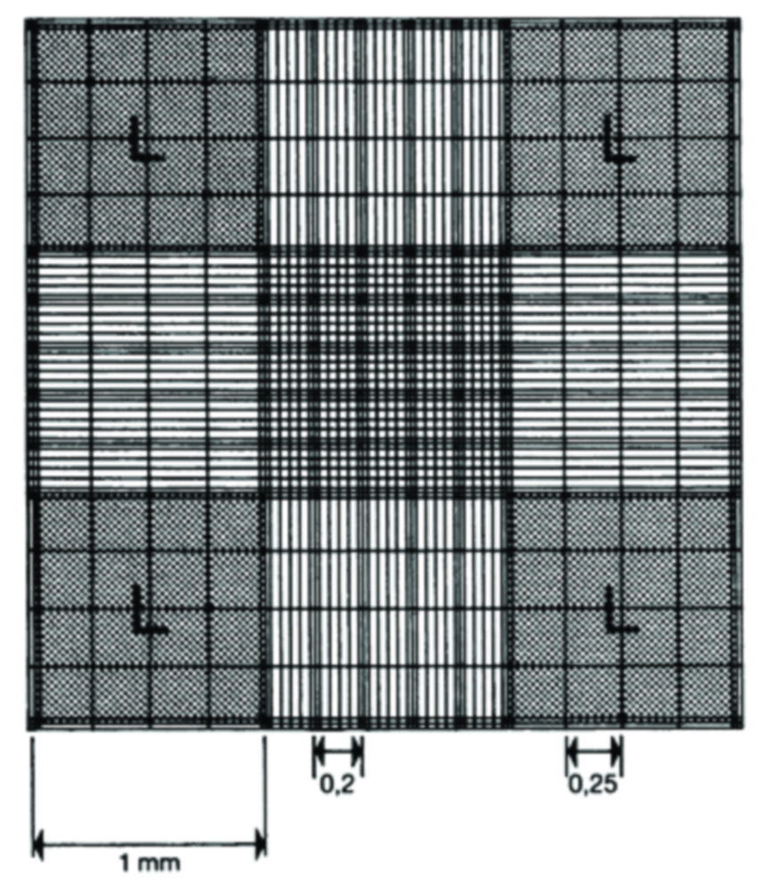 With double ruling. Calibratable. Cell depth 0.1 mm. Same ruling as Improved Neubauer, but the large square in the centre is divided into 16 squares each with a side length of 0.25 mm. Unlike the more modern Improved Neubauer counting chambers, the counting area of each group square is limited by the outermost of the triple border lines.