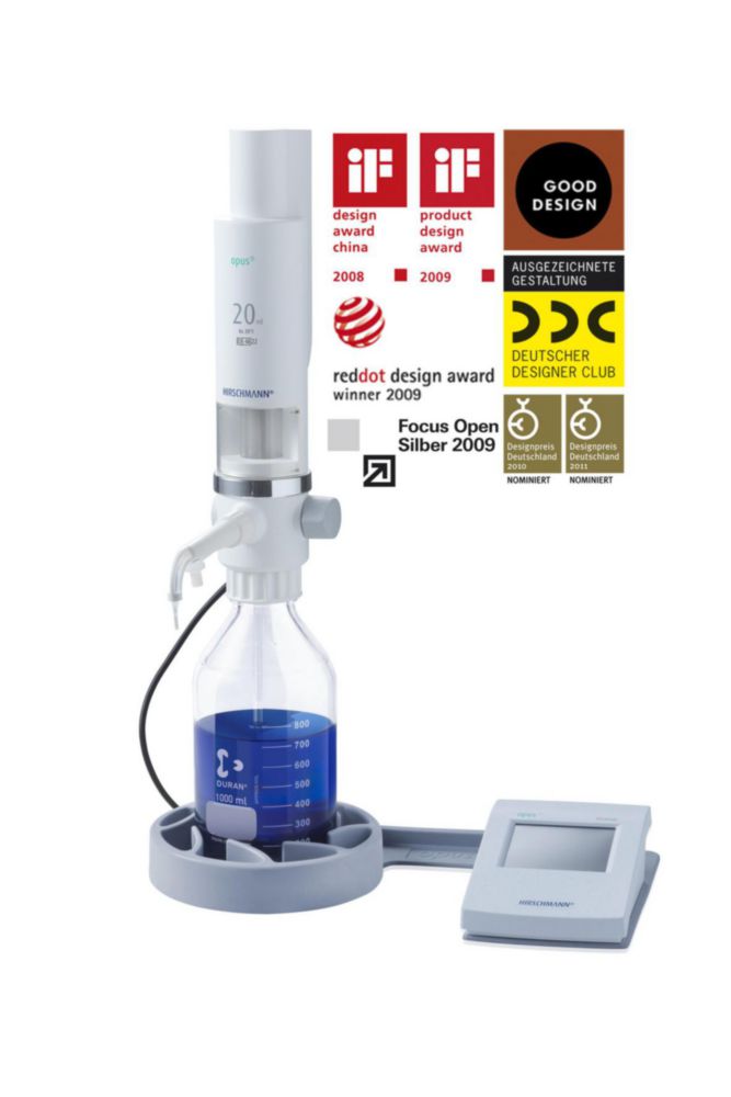 Supplied with: opus® titration complete with thread 45 mm, 3 adapters (A 32, A 38 and S 40), 1 screw coupled suction tube, 1 titration discharge unit and 1 power supply, 1 brown light protection window, touch screen module "titration", Data Power Cable 0.75 m, instruction manual, single calibration report