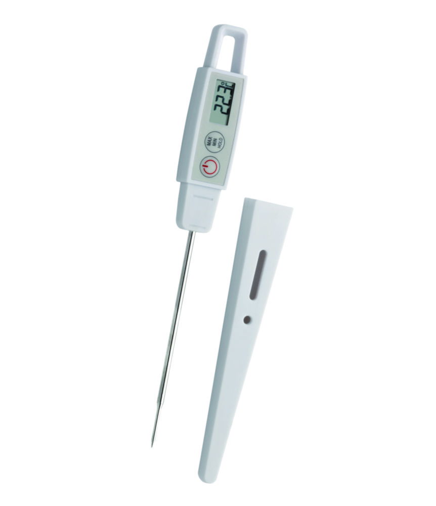 Watertight, ergonomic shaped pocket thermometer with robust insertion tip. The long sensor tube is particularly suitable to measure in liquids, food etc.