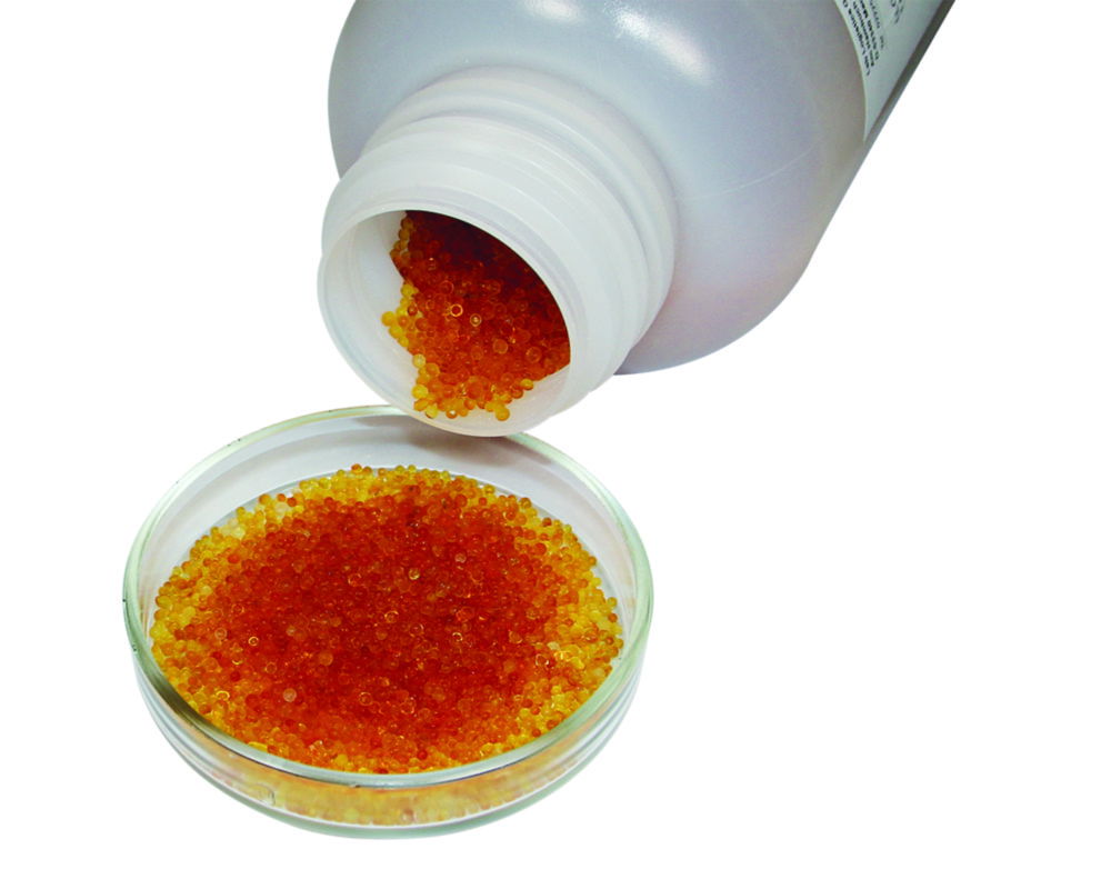 With orange indicator colour. Self-indicating drying agent free from any heavy metals and therefore environmentally compatible. The gel is naturally orange when active and at a 6 weight-% saturation level. As the gel adsorbs moisture, the colour changes into green.
