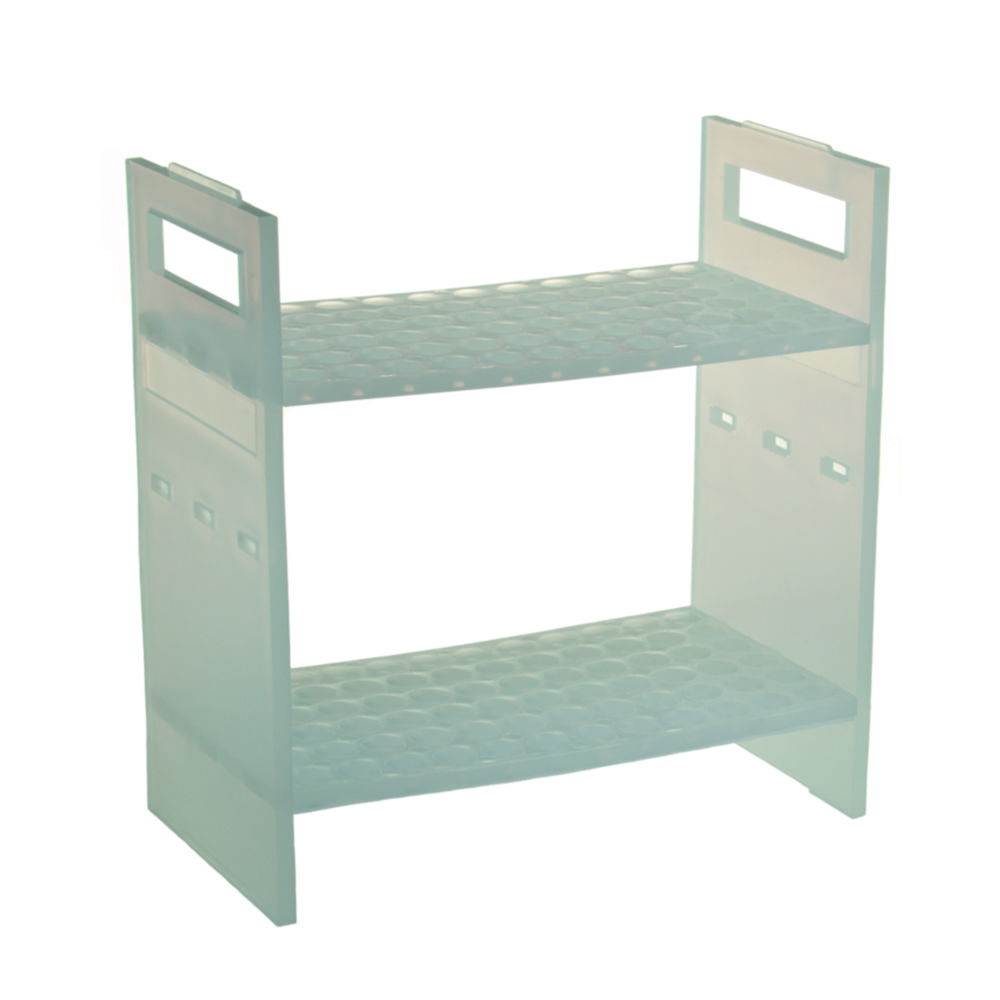 Polypropylene rack with carrying handles features an upper deck with holes and a lower deck support for tube ends. Stackable. For 72 (6 x 12) tubes with 3 or 5mm diameter. Autoclavable.