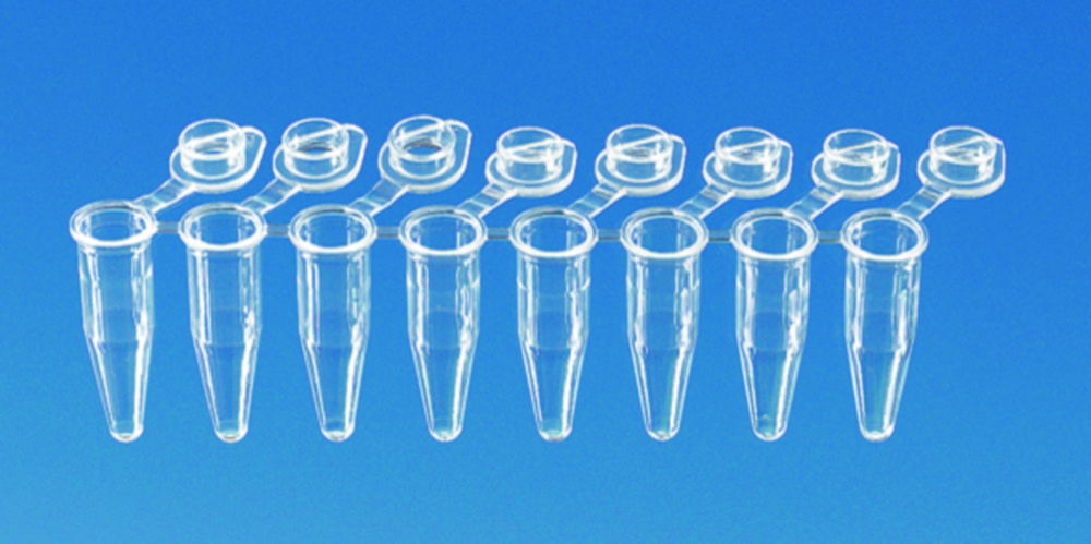 PCR tubes strips, PP, with attached single caps, 1 ridge
