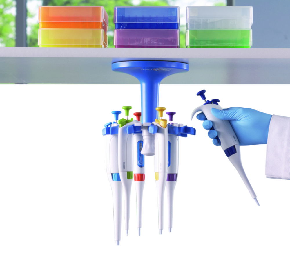 Unique pipette holder that gives you the option of using on the bench top, or hanging under shelf holder to help maximize your working space available.
