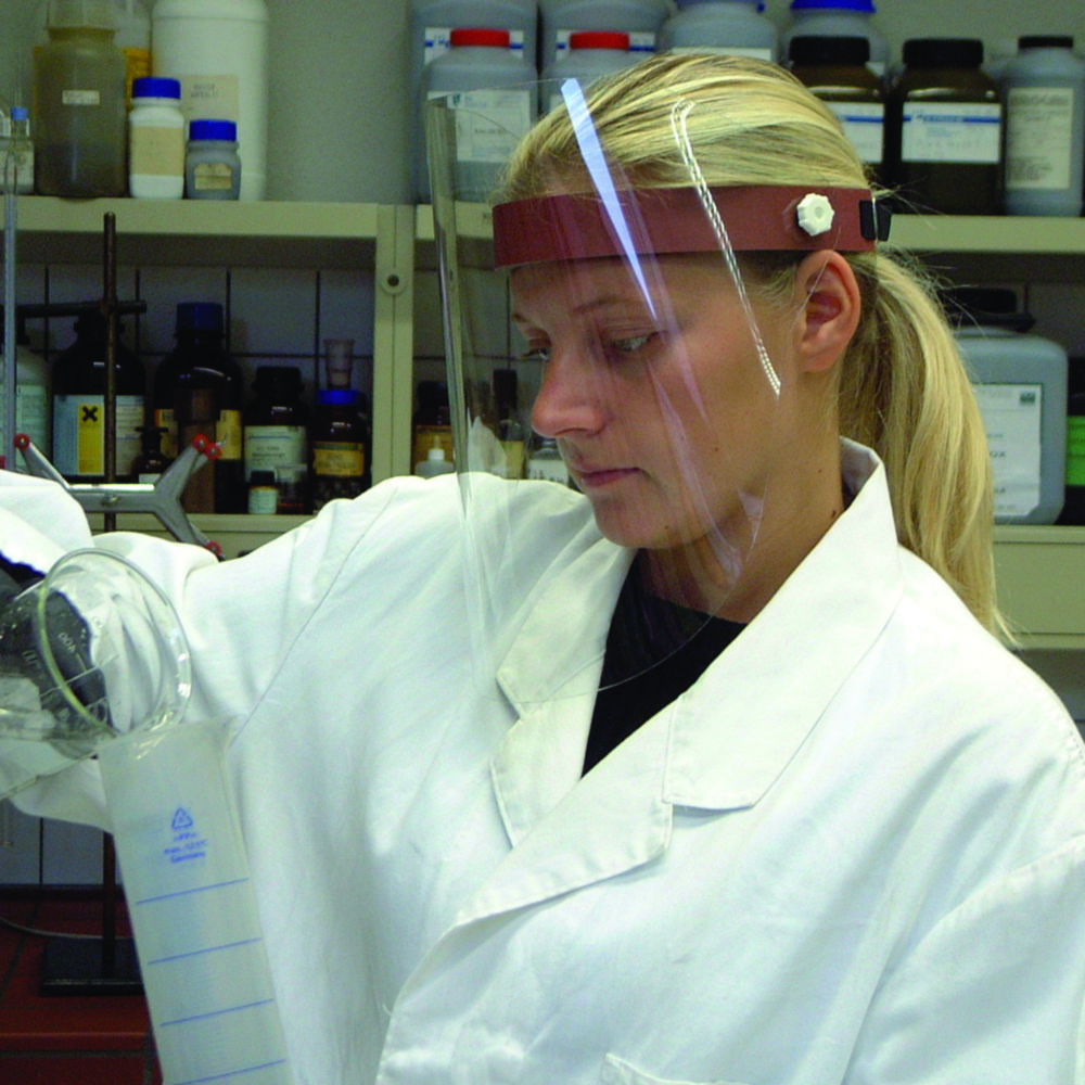 Shield headband made from vulcanised fibre. With interchangeable polyester visor. The large visor (410 x 285mm) gives unrestricted vision and also protects areas below and above the face. Visor can be tilted up and locked in any position.