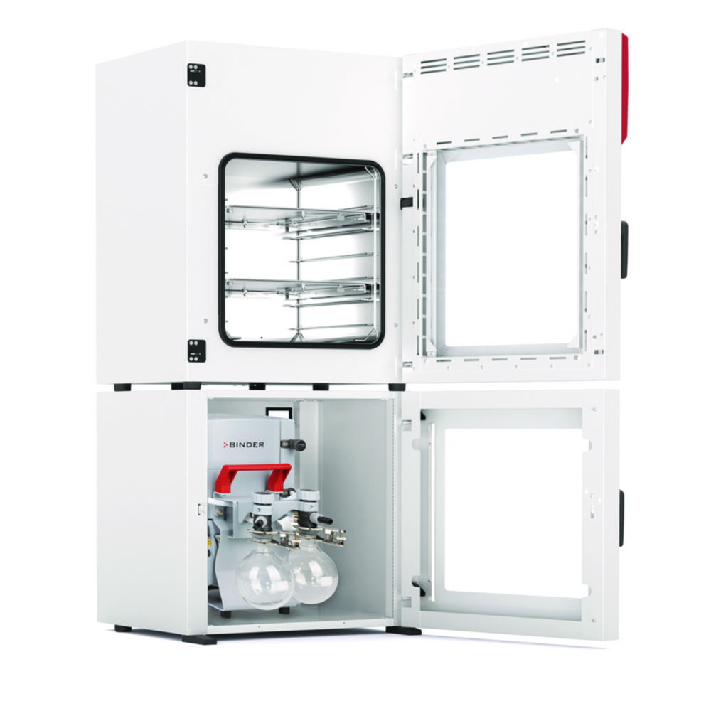 Set consisting of VP2 vacuum pump, pump cabinet (under cabinet) for housing the pump and a connection kit for connecting the pump to the VD series vacuum drying oven. The under cabinet raises the vacuum drying chamber to an ergonomic working height, reduces pump noise and protects the pump from mechanical damage. The pump cabinet contains a switchable socket that can be controlled via the controller of the vacuum drying oven.