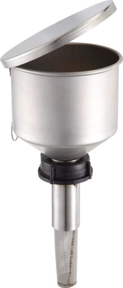 For safe filling of plastic canisters. With overfill protection, liquid level control, flame trap, earthing und cap. Filter to extract solid matter. From high quality and chemically resistant stainless steel, screw cap from PE.