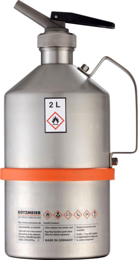 For safe storage, use and in-plant transports of flammable liquids. Explosion-proof by flame traps and pressure control valves. From high quality and chemically resistant stainless steel 316, gaskets from PTFE, ergonomic handholds.