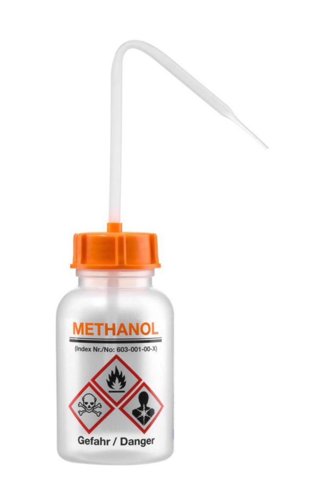 Laboratory safety wash bottle printed with symbols for hazardous substances. Leakproof. Description of contents is given in German, English and French. Scratch-resistant ink. Bottles can be fully emptied thanks to a movable outlet jet, also can be used upside down. Safety note: If the base of the jet is positioned above the liquid level, no liquid will be ejected in the event of a change in temperature. The jet tip is sealed for safety during transport and must be cut before use. With fitted LDPE washbottle cap.