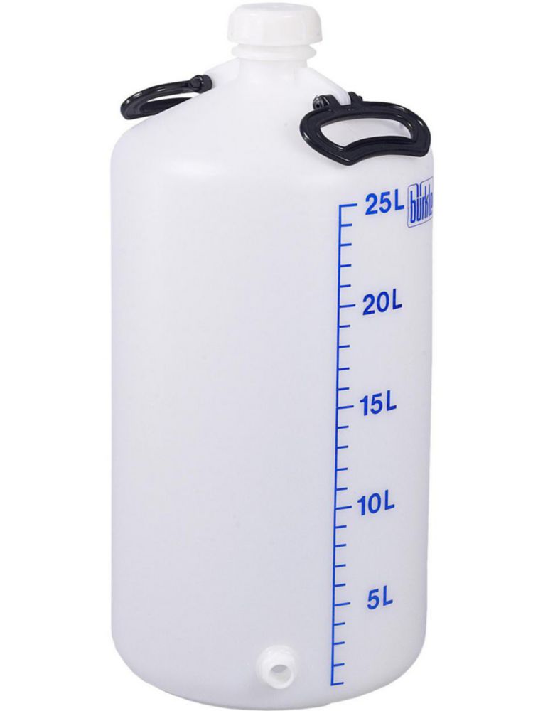 Thick walled, robust storage bottles with sturdy carrying handle for safe transport and storage. The storage bottles can also be used as aspirator carboys. Via a threaded connector, a stopcock or other accessories with an inner thread / cap nut of 3/4" can be attached.