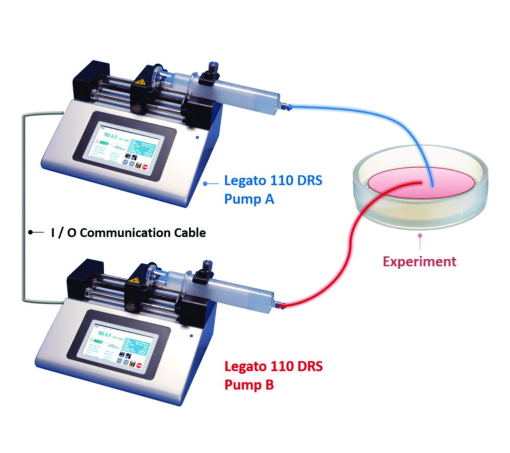 Dual syringe pump combination. Two Legato® 110 pumps connected by an input/output cable. Both pumps can be started synchronously and operated at different flow rates. The Legato® 110 is based on the Legato® 100. It offers infuse/withdraw flow control and programmability for up to two multi-step programs of 50 steps each. This pump is ideal for more complex multi-step dosing and has multi-mode operation.