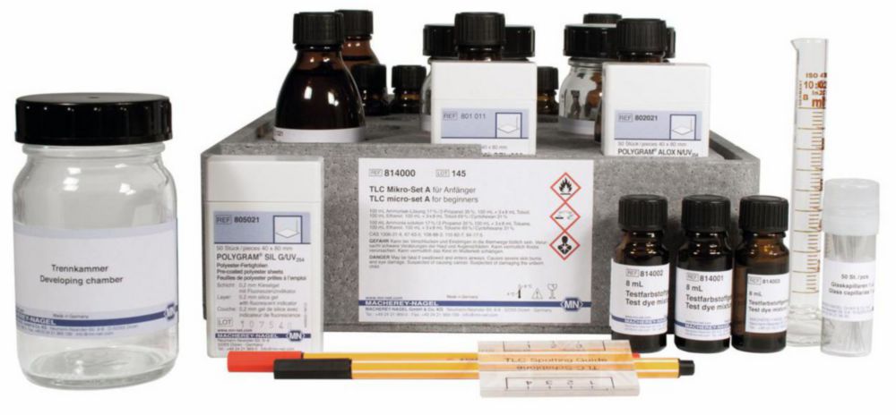 Features separations with simple developing sovents; samples are coloured thus eliminating the need for visualisation. All equipment needed is contained in the kit.
