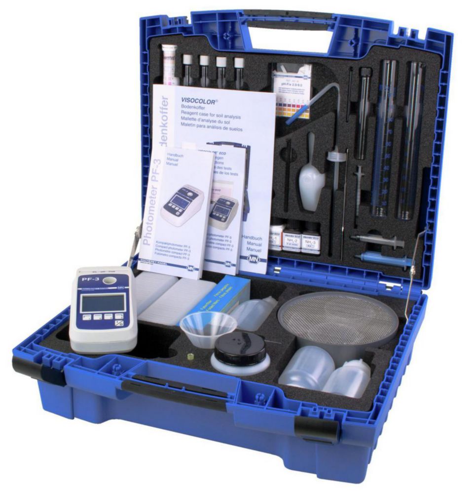The newest version of the VISOCOLOR® reagent case for soil analysis includes, beside reagents and accessories, also the compact photometer PF-3 Soil.